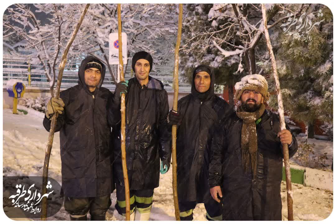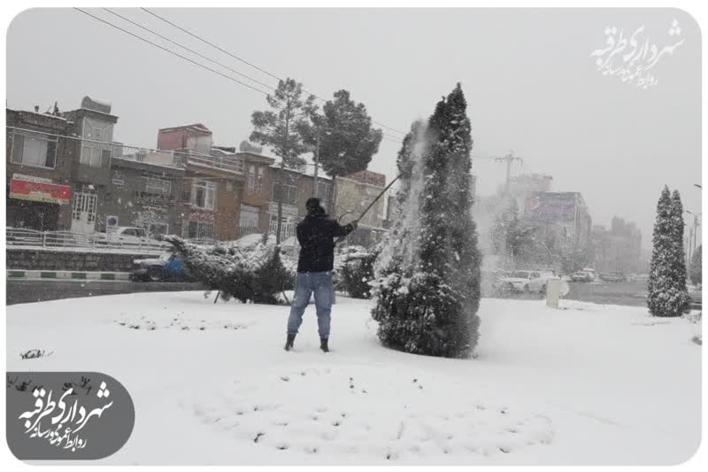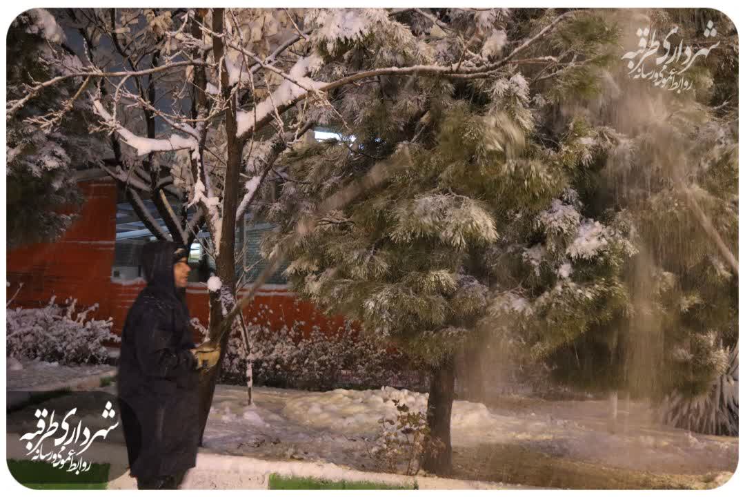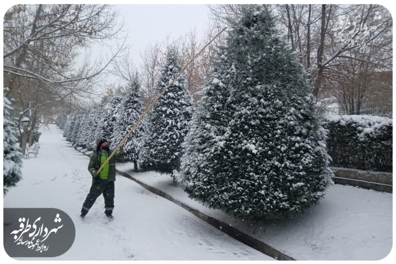 برف تکانی و برف روبی درختان وفضای سبز میادین ،بلوارها ، و بوستانها سطح شهر طرقبه توسط پرسنل اداره پارکها و فضای سبز شهرداری طرقبه